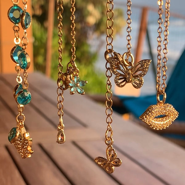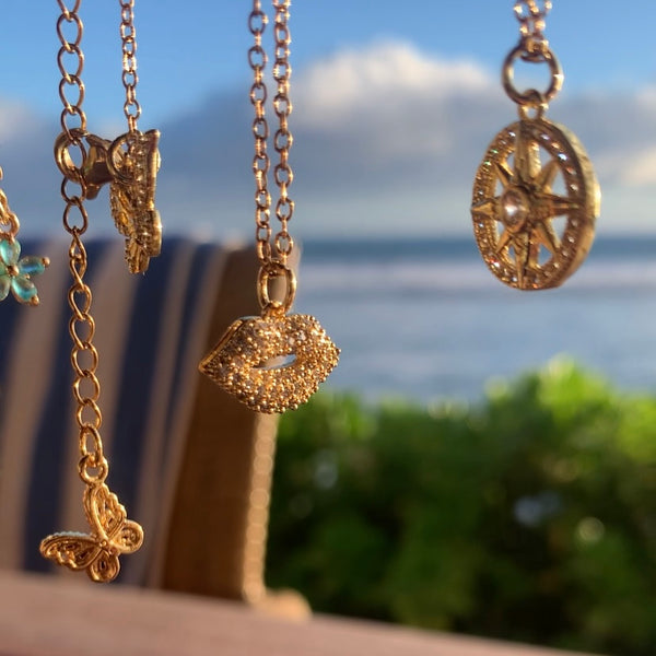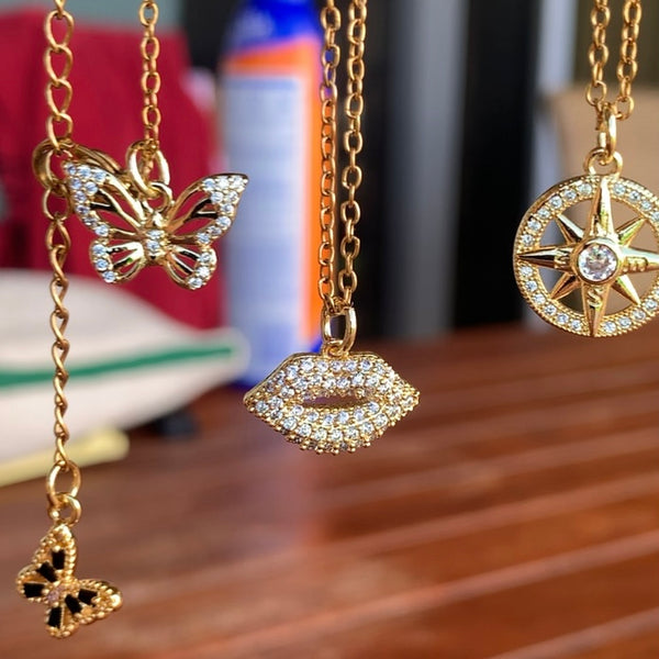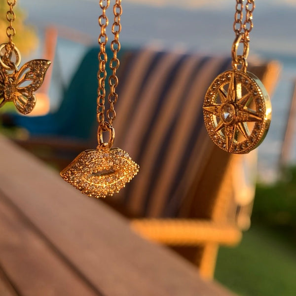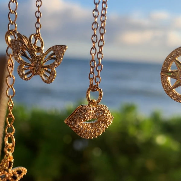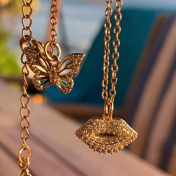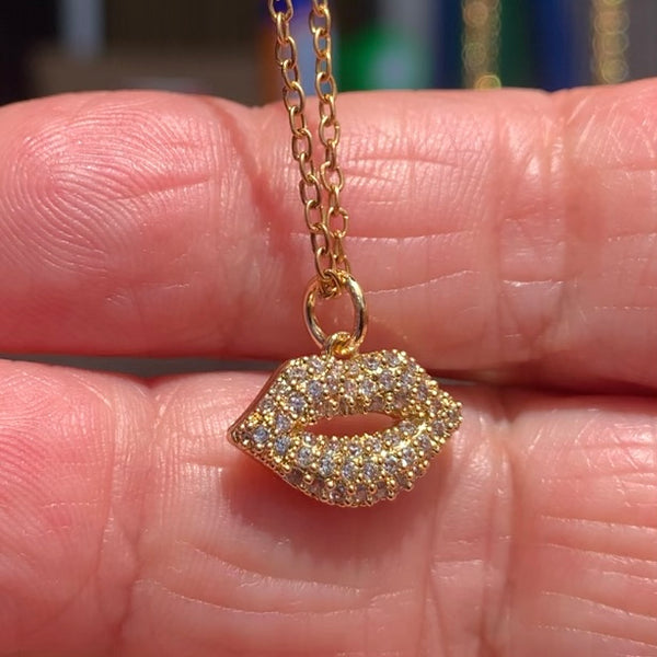 - π find your flirty sideΒ with our one of a kind gold toned crystal lips necklace.