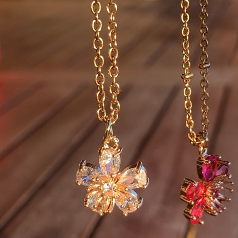 - Shine bright in our one of a kind gold toned crystal flower necklace.